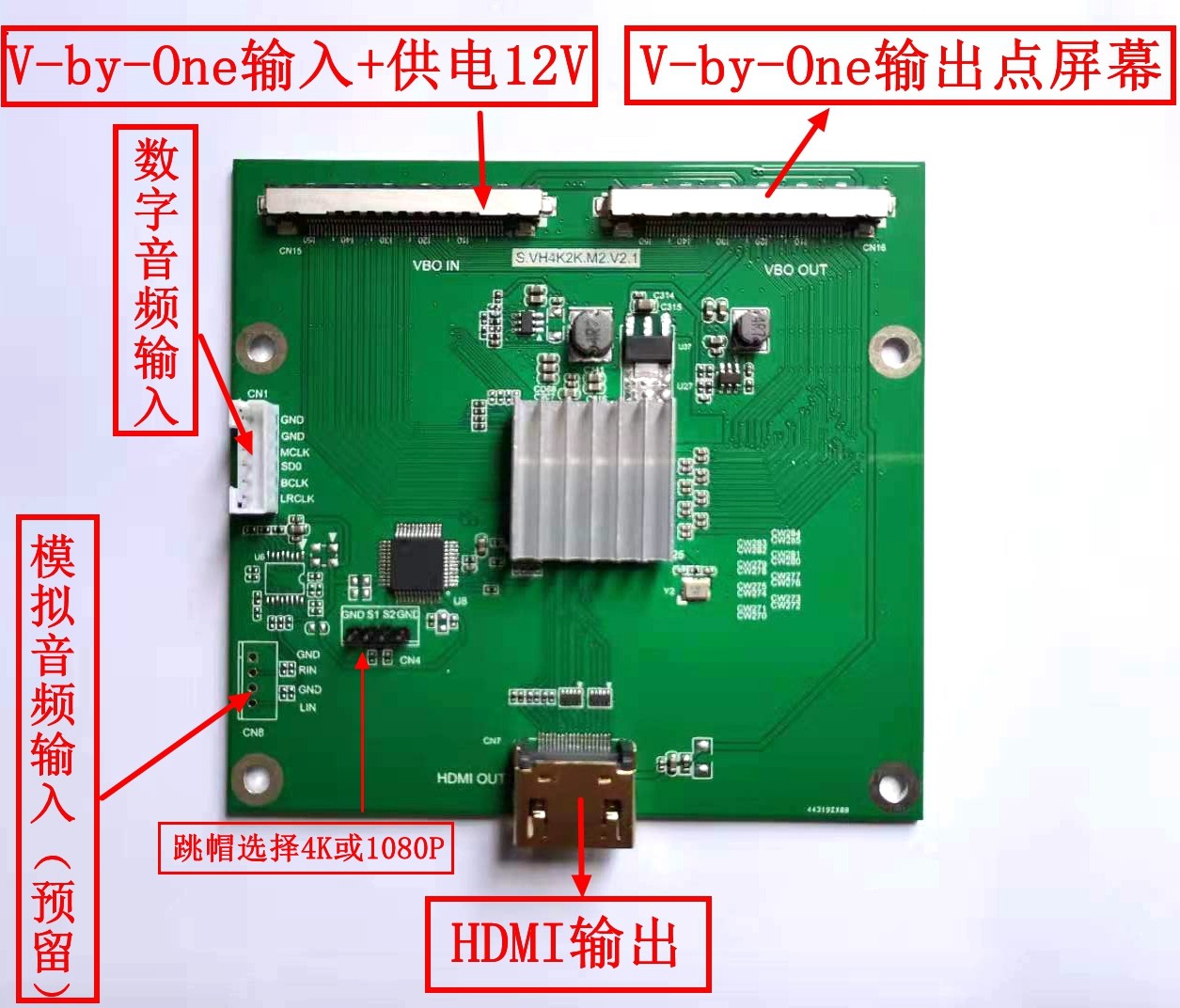 The S.VH4K2K.V2.0 board is a V-by-One signal bridge plus HDMI output adapter board developed by our company to solve the problems of electronic blackboards, large conference flat panels, 4K large screens, 4K driver board applications, etc. It can light up the original 4K screen and add an additional 4K HDMI signal output. The V-by-One to HDMI adapter board can be used in education systems, conference systems, commercial displays, matrices, advertising machines, medical displays, etc. This product supports software and hardware customization and debugging.